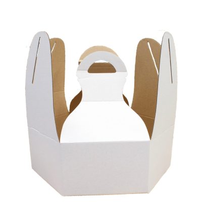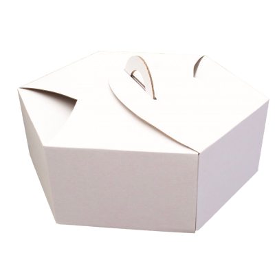 Caja de cartón microcorrugado, color blanco, con forma hexagonal, de medidas 22cm de ancho y 14cm de altura