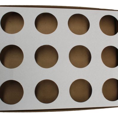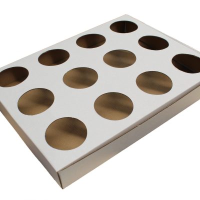 Charola de cartón microcorrugado blanco de 12 cavidades para vasos de 12 onzas, con medidas 42cmX31cmx5cm.
