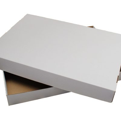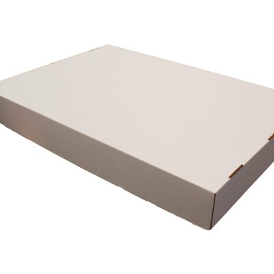 Caja de cartón microcorrugado, color blanco, de medidas 69cm de largo, ancho 48.5cm y 8cm de alto (base y tapa)