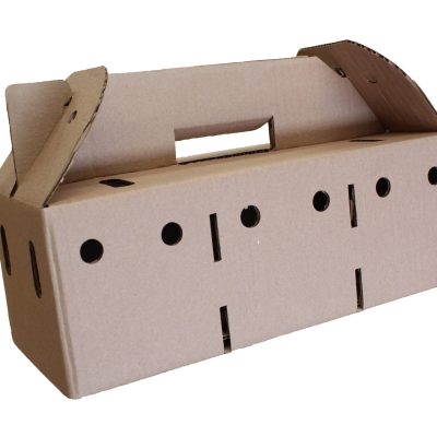 Caja de cartón corrugado sencillo, color cafe, con agarradera, de medidas 35.5cm de largo, ancho 15cm y 12.5cm de alto.